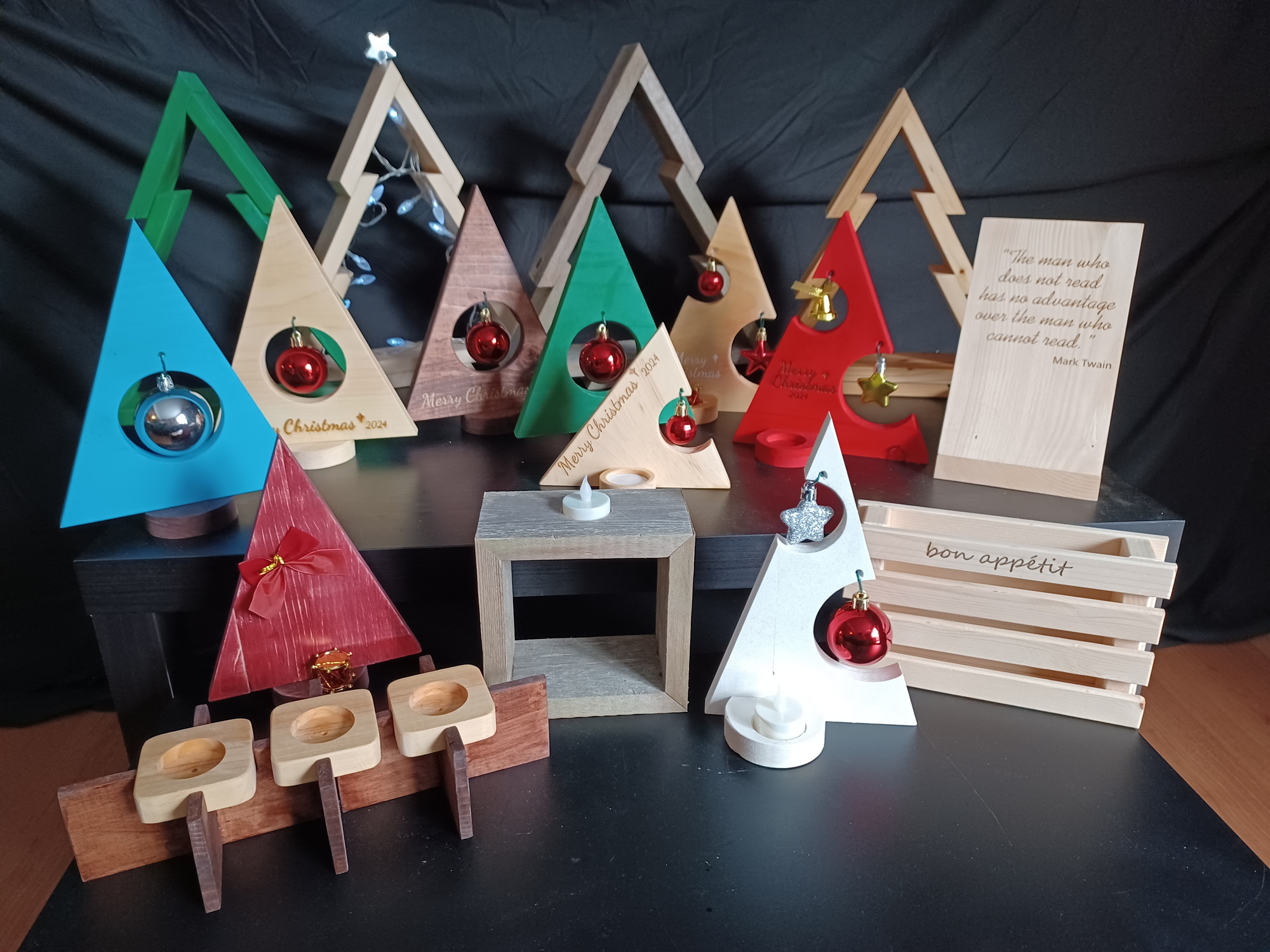 Items are for sale @ $ 25.00 each and customization is no extra charge. Except the book stand. It is $ 35.00 and the Christmas Trees are $ 40.00